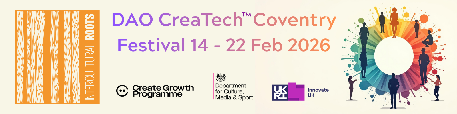 On Wednesday 18 February 2026, Intercultural Roots’ DAO CreaTech team and community artists in Coventry will host a full-day symposium at (TBC) The Box @ FarGo Village (09:30–18:30). The day will bring together artists, cultural practitioners, community organisers, technologists, funders and local partners to explore how decentralised tools, XR and AI can help communities shape and resource their own creative futures.